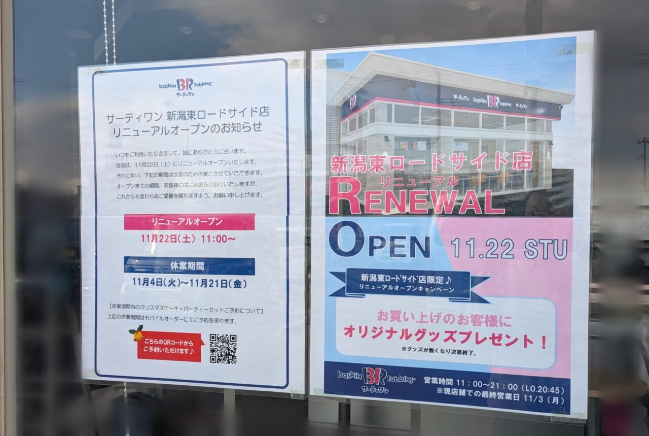 【新潟市東区】「サーティワンアイスクリーム 新潟東ロードサイド店」が改装のため休業していました。