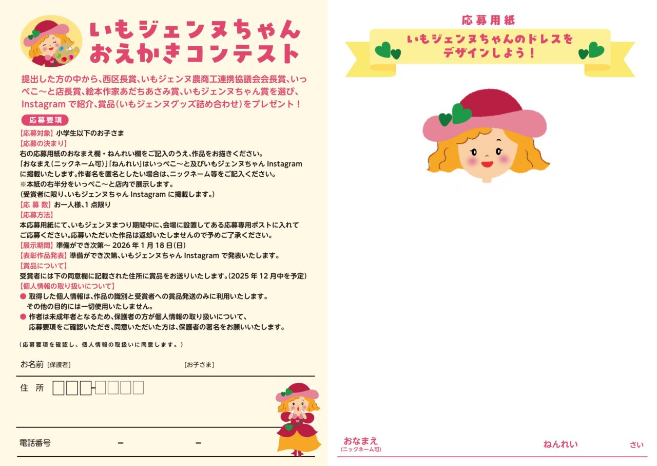 また、小学生以下限定で「いもジェンヌちゃんおえかきコンテスト」も開催されます。受賞者には、いもジェンヌちゃんオリジナルグッズ詰め合わせをプレゼント♪