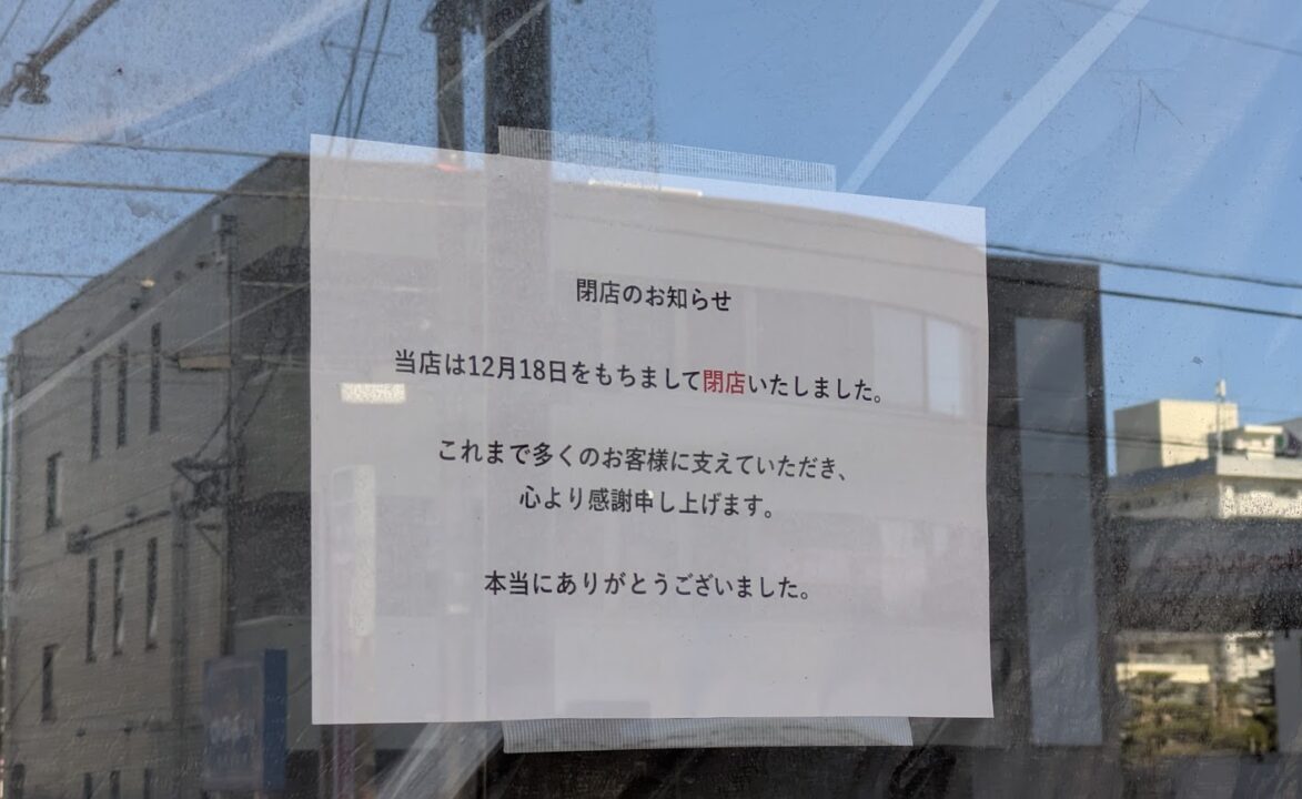 2025年12月28日に現地に伺うと、閉店のお知らせがありました。こちらによると、2025年12月18日(木)に閉店したそうです。