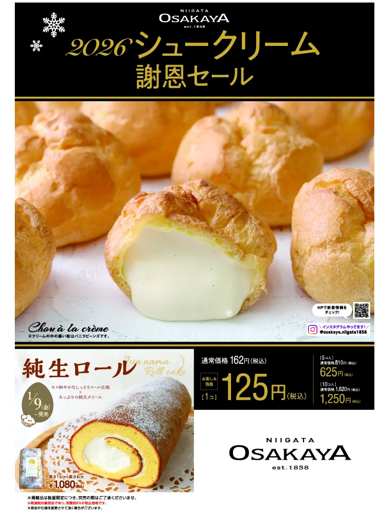新潟市江南区に本社をもつ菓子店「大阪屋」では、「2026シュークリーム謝恩セール」を開催します。