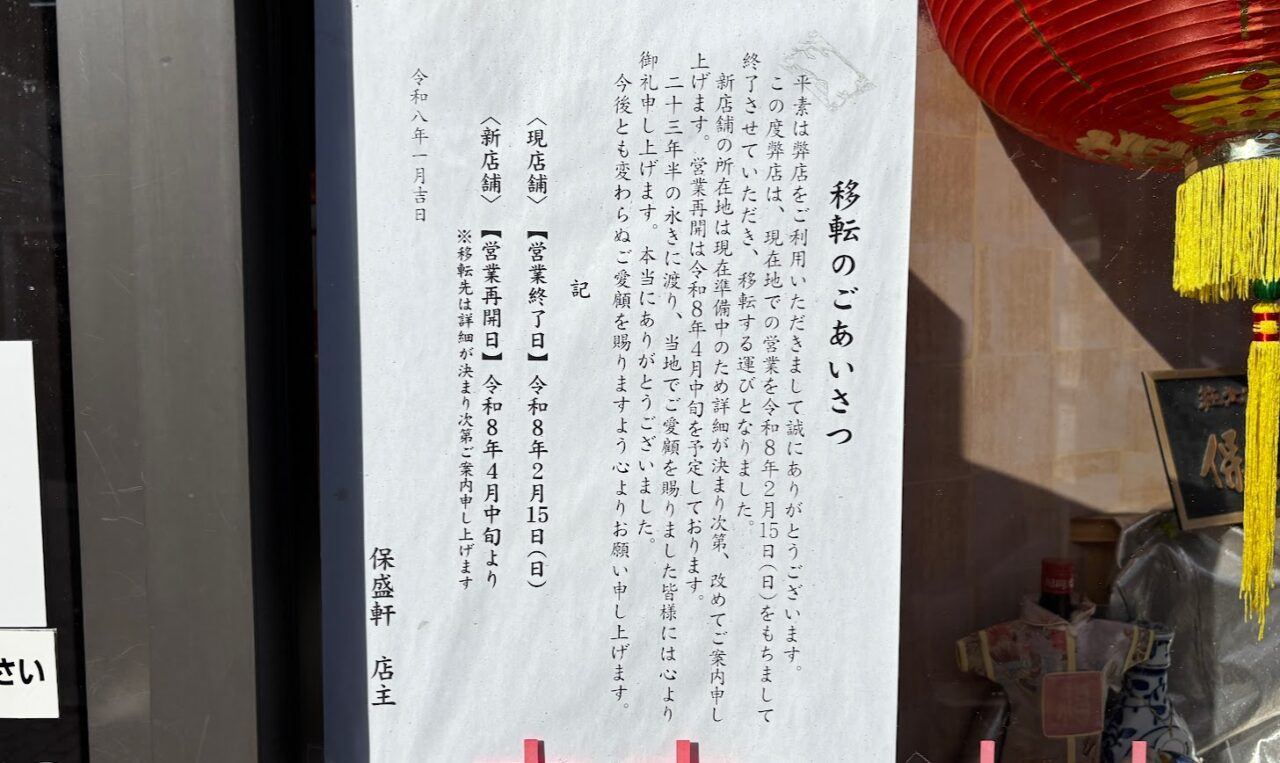 新潟市西区にある中華料理店「保盛軒(ほせいけん)」は、移転のため現店舗での営業を終了します。