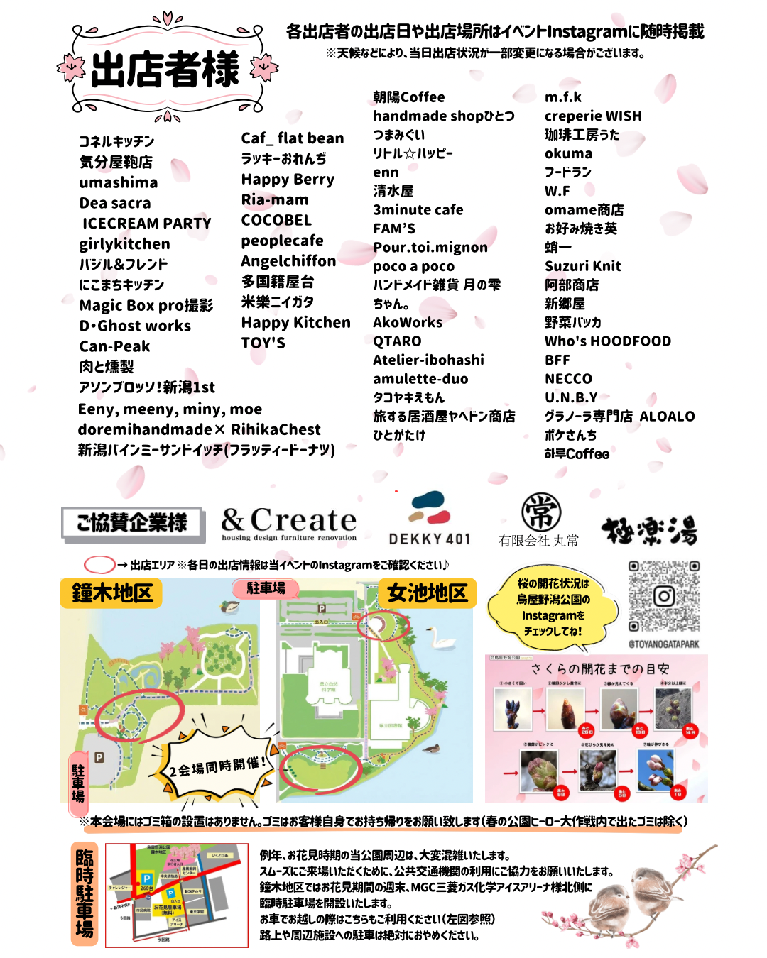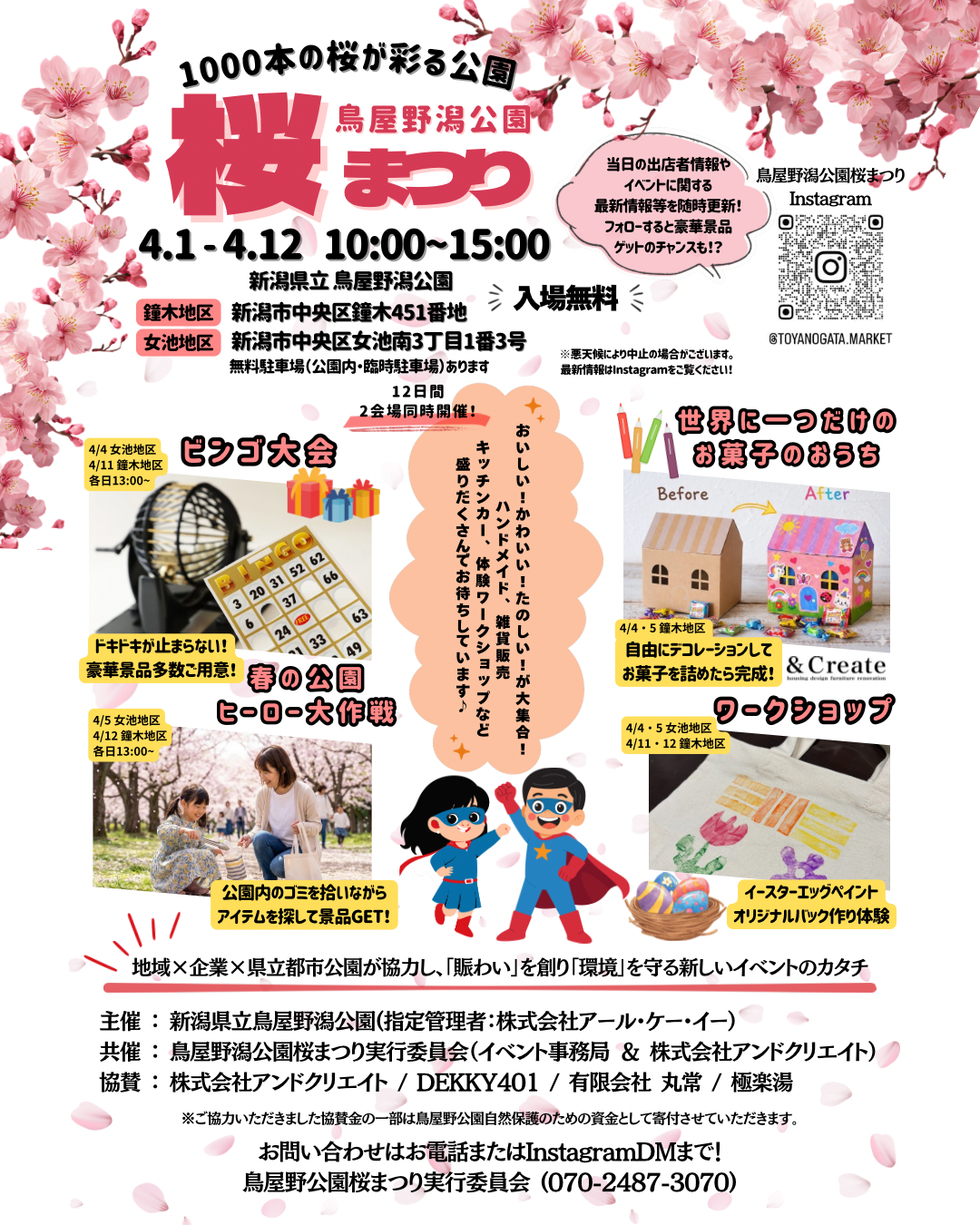 公園内のゴミ拾いをしながら景品をゲットできる「春の公園ヒーロー大作戦」や、「東京学館新潟高等学校 吹奏楽部」の演奏も予定されています。