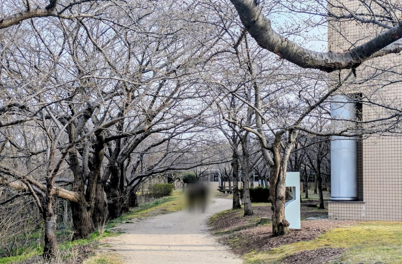 「県立図書館」裏手の道は桜の木が並んでいて、開花すれば「桜のトンネル」を歩けそうです。
